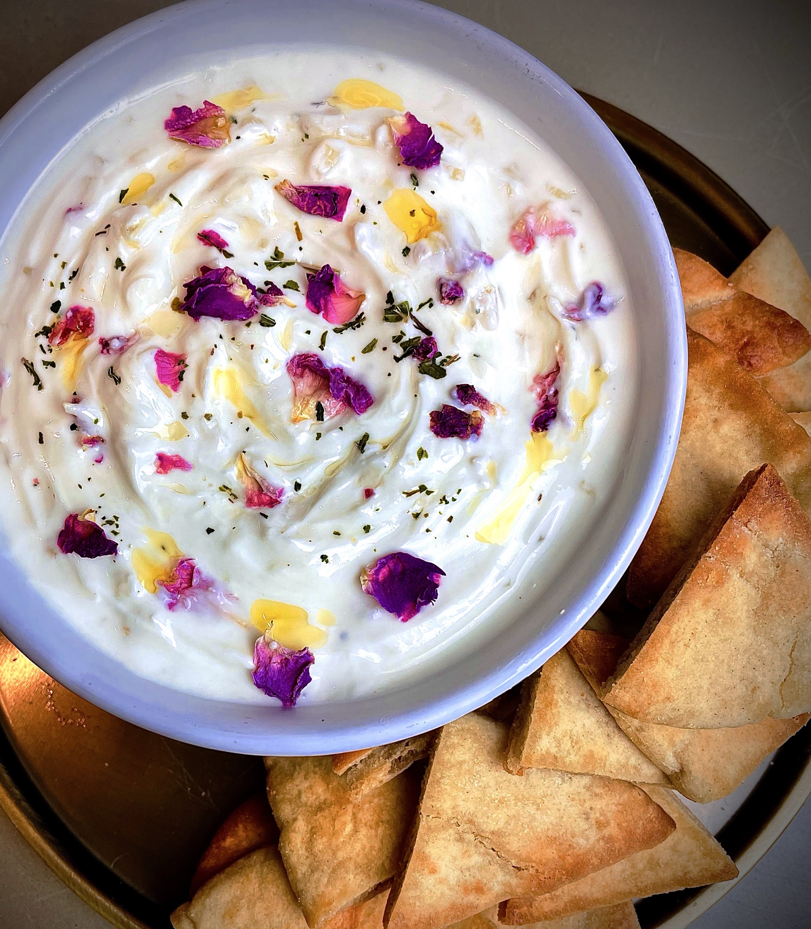 This dip can be eaten as an appetiser with a variety of crudités, crisps and flatbread. As an accompaniment to the main event, if you are making a Persian spread of food, a bowl of this dip will compliment all the dishes as pictured below.