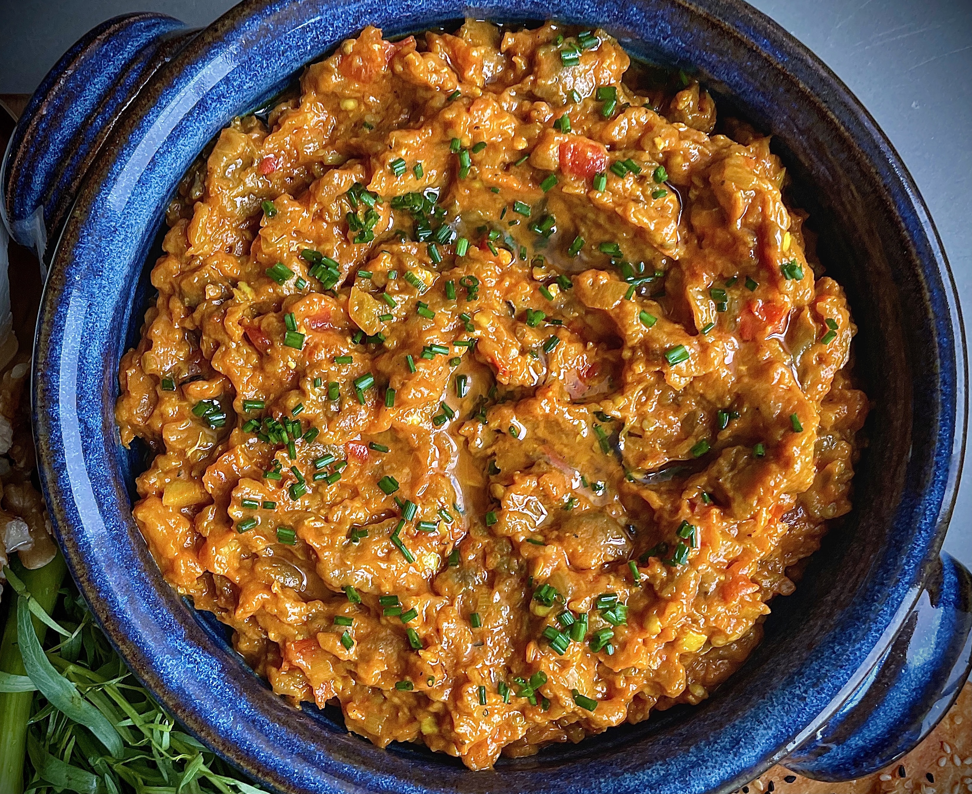 Smoked aubergine dip with tomatoes, garlic and eggs