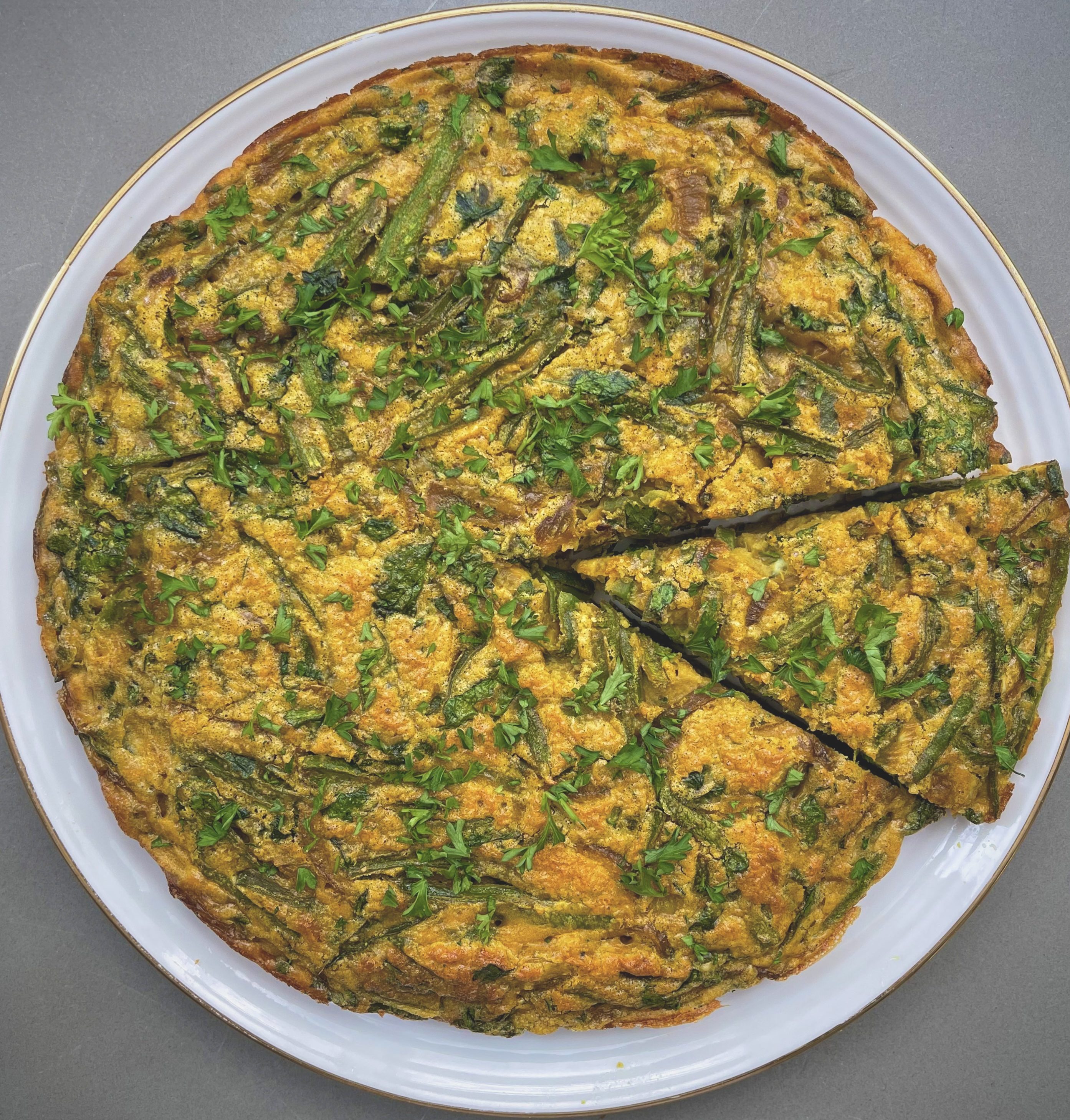 The key difference between a kuku and a frittata is the egg to vegetable ratio, with the kuku favouring the latter.