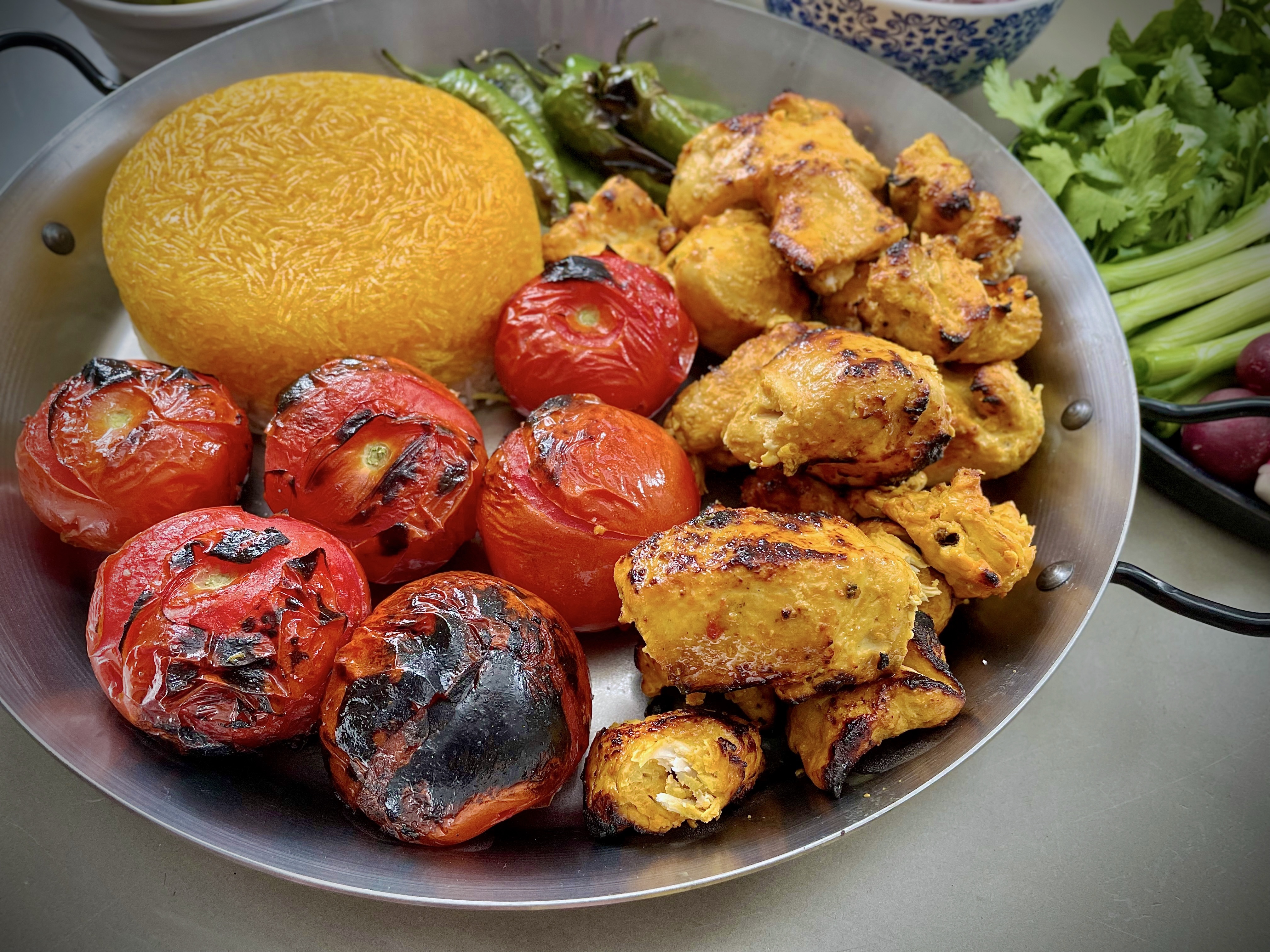 But it can be eaten with anything or any way you want, whether you want to eat it as a kebab roll with the chicken wrapped in some flatbread with salad, pickles and some garlic and / or chilli sauce alongside some chips; or with some rice or Tabbouleh or other healthy grain based salad.