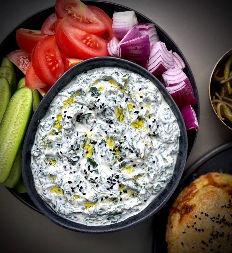 Drizzle a little olive oil on top of the borani and sprinkle some nigella seeds as a garnish. Serve with the spicy halloumi pasties or as an appetiser or as part of a mezze-style spread with flat-breads (or anything else you want to dip into it).