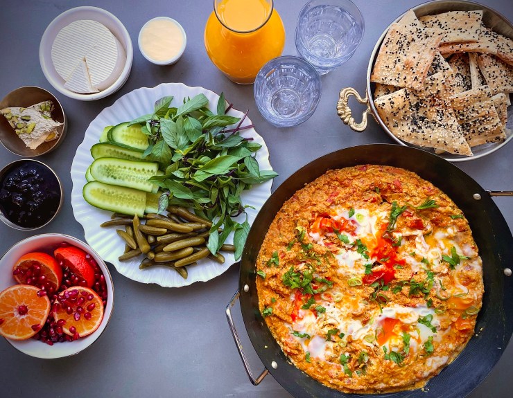 Season the eggs with a pinch of salt and pepper and sprinkle some chopped fresh coriander leaves on the dish prior to serving with flatbreads, Persian pickled cucumbers and / or fresh herbs.