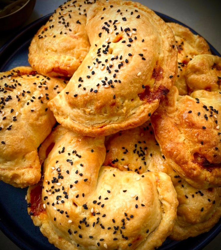 Place 1/8th of the filling on one side of one of the circles. Brush the edge of half the circle with beaten egg, then fold over the other half to make a D shape. Crimp the edge using a fork or the back of a knife. Then gently push the tips towards each other to create more of a crescent shape. Make a hole in the top to allow some air to escape and place on a lined baking tray. Repeat with the other 7 circles. Brush with the beaten egg, sprinkle with nigella and sesame seeds and bake on a baking tray for 30 to 40 minutes or until they are golden.